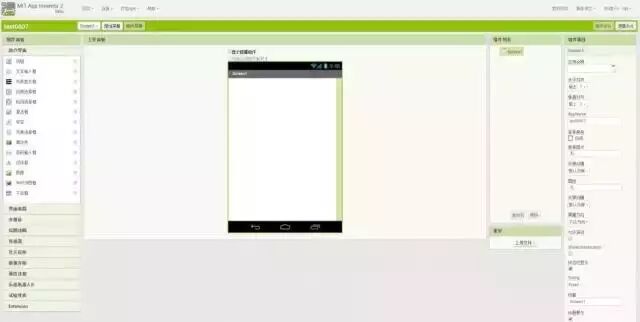 APP Inventor的項(xiàng)目分為“組件設(shè)計(jì)”和“邏輯設(shè)計(jì)”兩部分,上圖是組件設(shè)計(jì)界面。