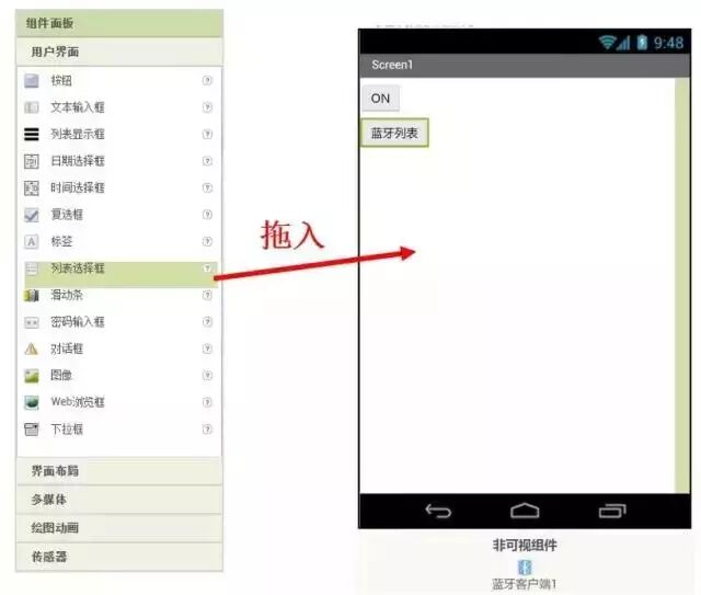 藍(lán)牙模塊需要選擇之后才能連接,所以這里需要添加一個(gè)“列表選擇框”組件。