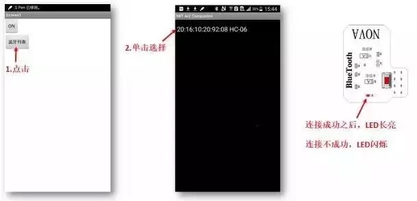 供電之后,藍(lán)牙模塊上的LED燈會(huì)閃爍,表示未連接,一旦連接成功,LED將變?yōu)殚L(zhǎng)亮。