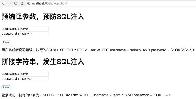 這是最常見(jiàn)的 SQL注入攻擊,當(dāng)我們輸如用戶(hù)名 admin ,然后密碼輸如' OR '1'=1='1的時(shí)候,我們?cè)诓樵?xún)用戶(hù)名和密碼是否正確的時(shí)候,本來(lái)要執(zhí)行的是SELECT * FROM user WHERE username='' and password='',經(jīng)過(guò)參數(shù)拼接后,會(huì)執(zhí)行 SQL語(yǔ)句 SELECT * FROM user WHERE username='' and password='' OR '1'='1',這個(gè)時(shí)候1=1是成立,自然就跳過(guò)驗(yàn)證了。