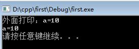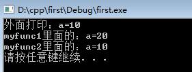 #include<iostream>#include<string>using namespace std;const int a = 10;void myfunc1() {const int a = 20;printf("myfunc1里面的:a=%d ", a);}void myfunc2() {printf("myfunc2里面的:a=%d ", a);}int main() {printf("外面打?。篴=%d ", a);myfunc1();myfunc2();system("pause");return 0;}