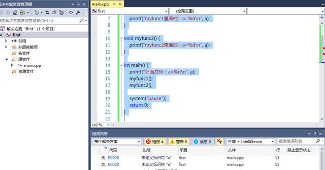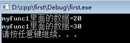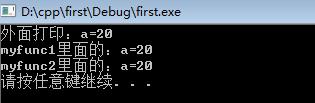 #include<iostream>#include<string>using namespace std;void myfunc1() {const int a = 20;printf("myfunc1里面的:a=%d ", a);}void myfunc2() {printf("myfunc2里面的:a=%d ", a);}int main() {printf("外面打?。篴=%d ", a);myfunc1();myfunc2();system("pause");return 0;}