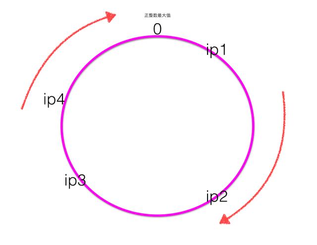 hash(ip1),hash(ip2),hash(ip3),hash(ip3),計算出來的hash值是0~最大正整數(shù)直接的一個值,這四個值在一致性hash環(huán)上呈現(xiàn)如下圖: