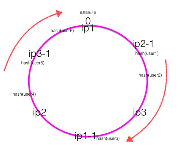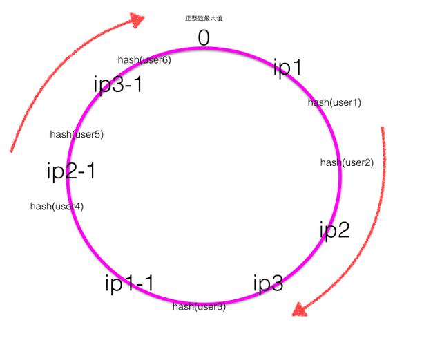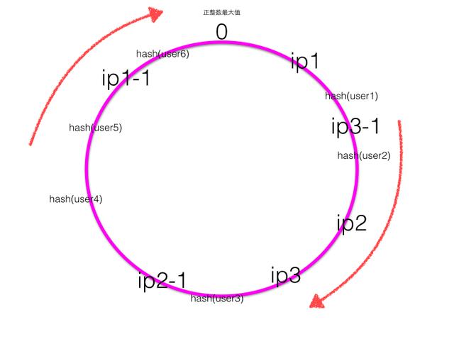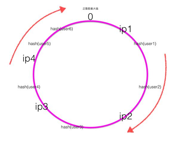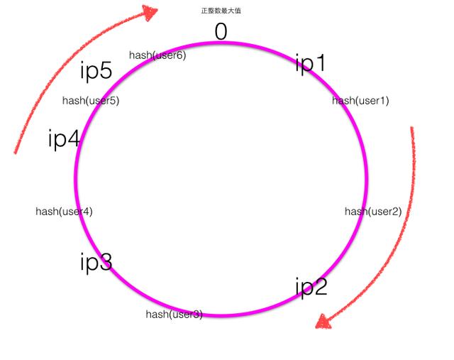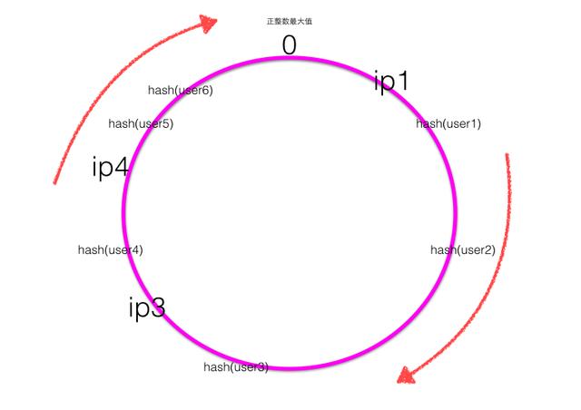 當(dāng)用戶在客戶端進(jìn)行請求時候,首先根據(jù)hash(用戶id)計算路由規(guī)則(hash值),然后看hash值落到了hash環(huán)的那個地方,根據(jù)hash值在hash環(huán)上的位置順時針找距離最近的ip作為路由ip.