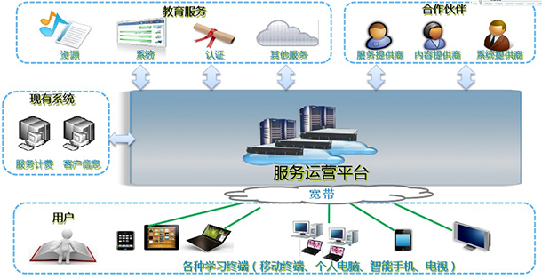 管理合作伙伴,包括服務商、內容商、系統(tǒng)商,為其提供平臺窗口,加速新業(yè)務開展。整合教育服務資源,為用戶提供統(tǒng)一的服務訂購、資源訪問、互動交流渠道。可以方便與多種其他系統(tǒng)進行對接,增強系統(tǒng)功能,提升服務水平。