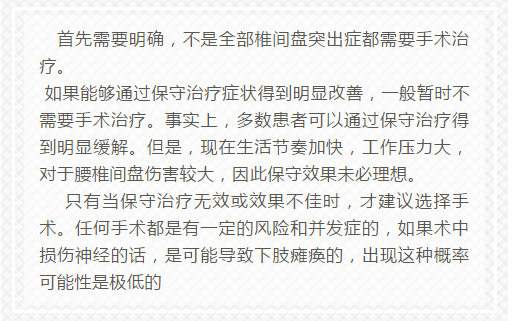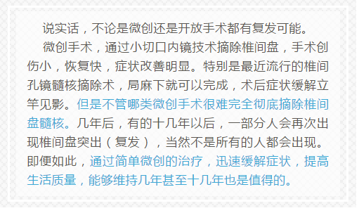 常聽人說,我有“椎間盤突出”。有的人甚至“突出”很多年,到處就醫(yī),對其治療方法了如指掌,想保守治療,盡量不做手術(shù)。 患者最大的擔心就是:1、手術(shù)萬一不成功,癱瘓了怎么辦? 2、手術(shù)做完后,萬一復發(fā)怎么辦?