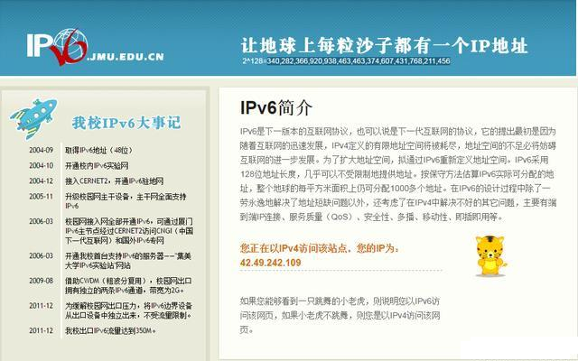 我們設(shè)置完成后可以輸入http://ipv6.jmu.edu.cn/網(wǎng)址測試下是否成功,如果你能夠看到一只跳舞的小老虎,則說明你以IPv6訪問該網(wǎng)頁,如果小老虎不跳舞,則是以IPv4訪問該網(wǎng)頁。