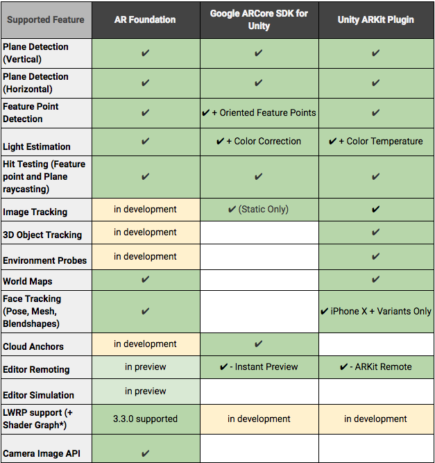 今天,AR Foundation提供了一個跨平臺腳本API和MonoBehaviours,用于制作核心功能相同的ARCore和ARKit應(yīng)用程序。這樣你可以開發(fā)一次應(yīng)用程序并部署到兩個設(shè)備,無需任何改動。有關(guān)AR Foundation中當(dāng)前支持功能的完整列表,請參閱下圖。