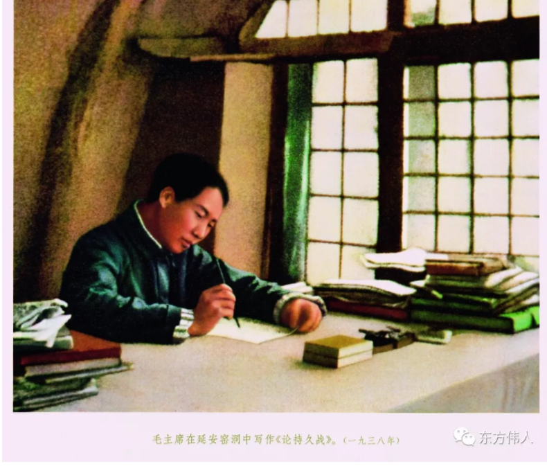 1938年5月,毛澤東再次把自己關(guān)在了窯洞里,他七天七夜沒有出門,除了一天兩頓稀飯和咸菜外,就是不停地抽著劣質(zhì)的紙煙,埋頭寫作,以至于連棉鞋被火盆烤著了,他也渾然不覺,警衛(wèi)員賀清華后來說:“七天七夜不睡覺,就是鐵人也要熬倒了啊,主席當(dāng)時真是拼了命了。”毛澤東就是在這七天七夜里寫成了《論持久戰(zhàn)》。
