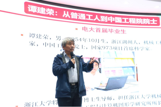 譚建榮分享了自身年輕時期的學習、工作經(jīng)歷,介紹自己出生于動蕩年代,初中畢業(yè)后因為特殊時期“求學無門”,做了15年的技術工人,在中央廣播電視大學開始招生之時,把握住了這彌足珍貴的機會,成為電大的首屆學生。三年時間里他一口氣修完機械工程和電子工程兩個專業(yè)的課程。“不斷學習和不斷提高是人生永恒的主題”,他說,電大課堂上樹立起來的求實學風對他有著深遠影響。譚建榮以蘇步青、華羅庚等科學家的人生經(jīng)歷詮釋了實事求是的科研態(tài)度;用自己的座右銘、諸葛亮的《誡子書》和王國維《人間詞話》,叮囑在場師生們在生活和學習中要肯努力、肯勤奮、肯吃苦,以創(chuàng)新和拼搏精神贏得出彩人生。譚院士結合自身經(jīng)歷,旁征博引,從不同的角度與層次闡述了自己對終身學習的理解,引起現(xiàn)場師生的強烈共鳴和深刻思考。